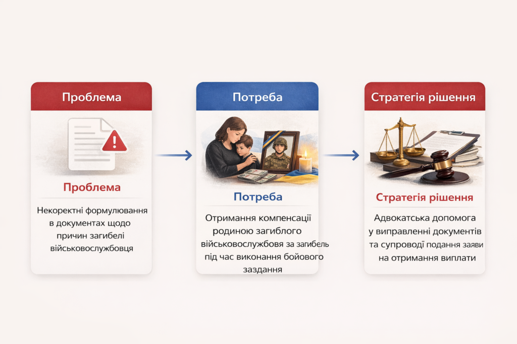 У цьому кейсі до адвоката звернулася сім’я військовослужбовця, який загинув під час виконання бойового завдання в бойовій частині. Родина прагнула отримати передбачену законодавством компенсацію, однак зіткнулася з рядом проблем: відсутністю частини документів, нечіткими формулюваннями у висновках службового розслідування та затягуванням процесу розгляду справи. Такі ситуації є типовими для подібних категорій справ і потребують чіткого юридичного супроводу.
