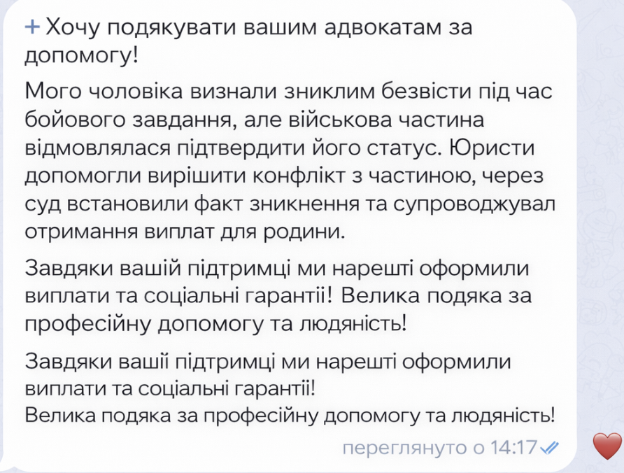 Після первинної консультації юристи провели комплексну правову роботу для встановлення факту зникнення військовослужбовця та супроводу оформлення державних виплат.