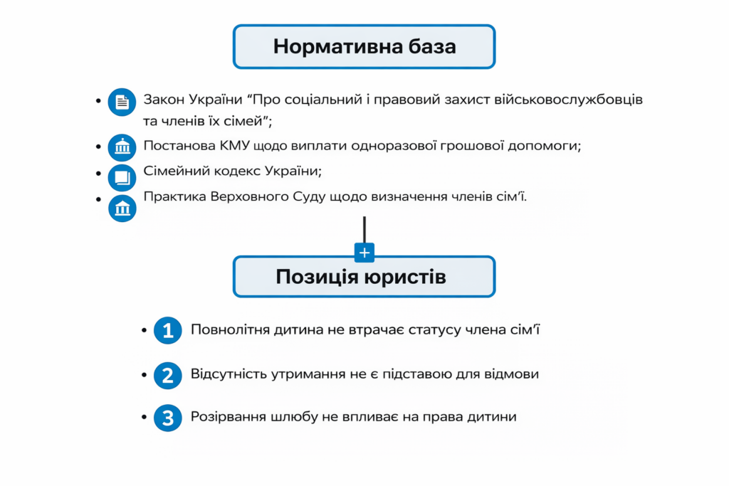 У практиці військового права все частіше виникають складні ситуації, пов’язані з виплатою одноразової грошової допомоги (ОГД) членам сімей військовослужбовців, які зникли безвісти. Особливу складність становлять випадки, коли сімейні відносини були припинені, а право на отримання виплати заявляє повнолітня дитина.