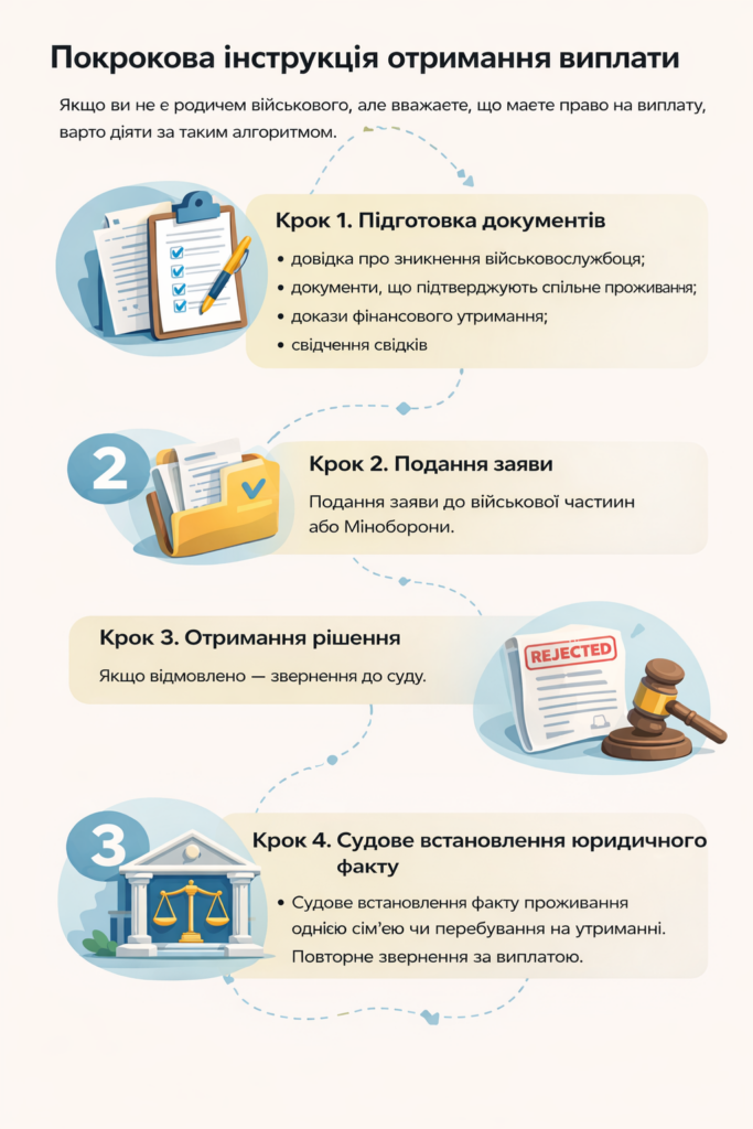 Як показує практика, органи соціального захисту та військові частини часто відмовляють у виплатах, якщо людина не є офіційним родичем. Саме тому важливо правильно підготувати документи та юридичну позицію.