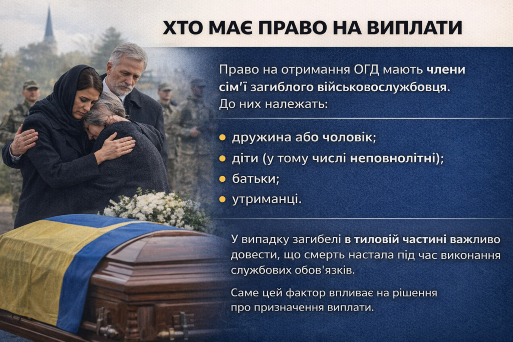 Право на отримання ОГД мають члени сім’ї загиблого військовослужбовця. До них належать: