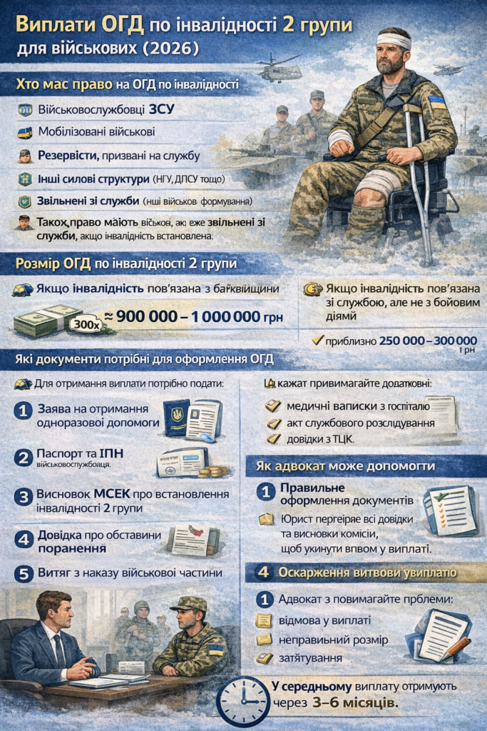 У разі встановлення 2 групи інвалідності військовий має право на значну одноразову виплату від держави.