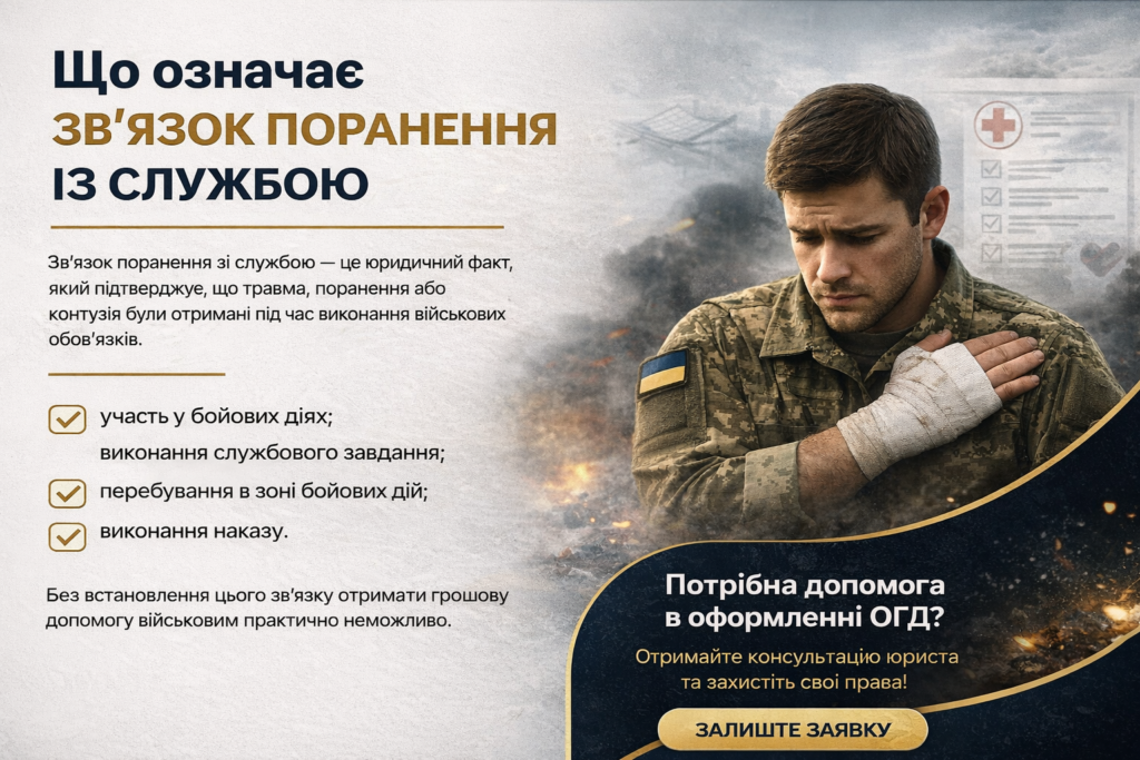 Доведення зв’язку поранення зі службою — ключова умова для отримання одноразової грошової допомоги (ОГД). Саме цей фактор визначає, чи має військовослужбовець право на компенсацію від держави. На практиці багато військових стикаються з проблемами: документи оформлені неправильно, висновки не відповідають реальним обставинам, або взагалі відсутні необхідні підтвердження.